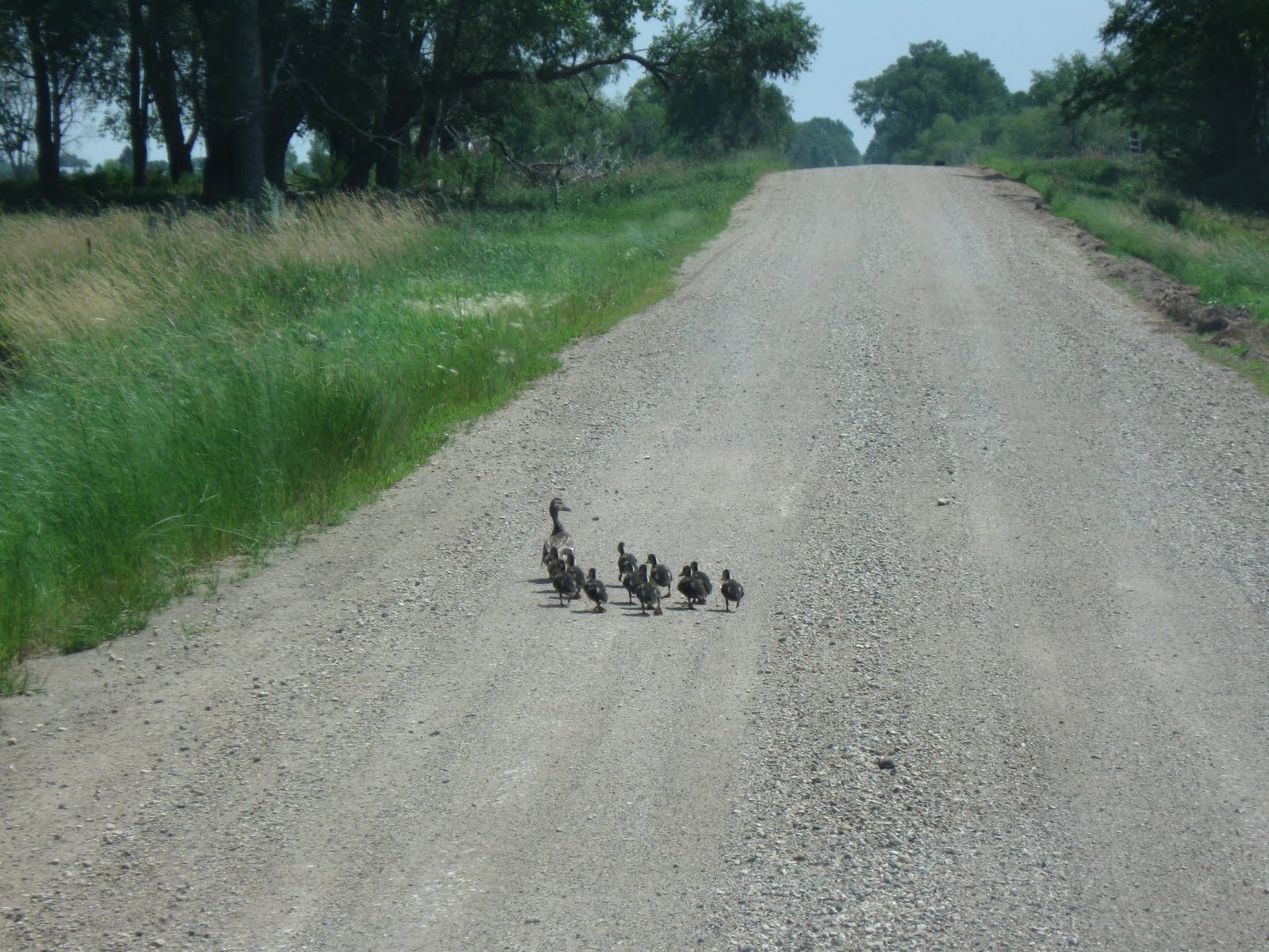 Mama duck was quite proud of her brood of twelve, and wasn't at all quick to waddle them on across the road and into the ditch.